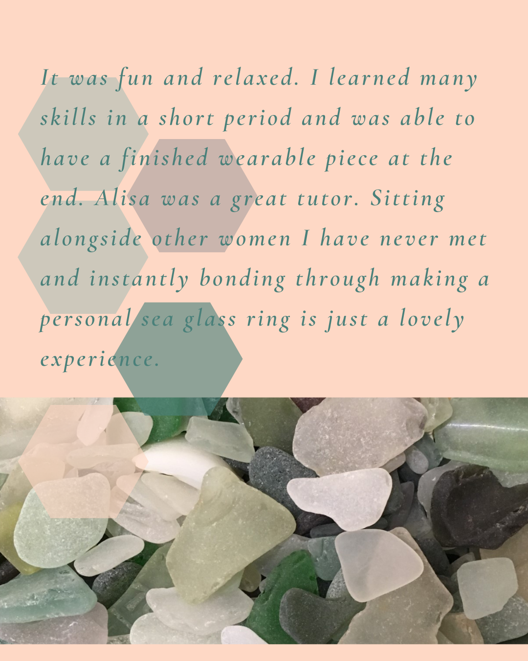 - We’ll provide everything you’ll need for your sea glass rings workshop, including tools and silver; however, if you’d like to make a particularly large setting or use a longer chain, there may be a small surcharge.